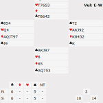 - Best way to play 3NT?This hand is taken from the SBC Harmony Park Swiss Pairs congress played on 14 February 2026 (match 4). Every pair except one played 3NT by South – most commonly after a simple auction 1NT (15-17) 3NT. Every West led ♦Q which … Continue reading