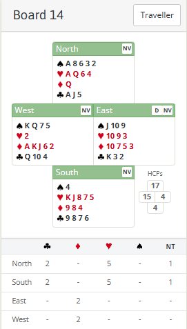When you hold 54 in the majors and shortage in the opened minor it’s often a dilemma whether to overcall your 5 card suit or start with a takeout double. Board 14 was an example last week – and it made quite a difference to the contract reached!