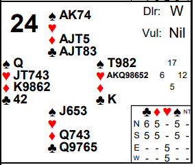 Sure enough there ended up only being two black aces to lose for +650 in 5♥x, a score that happened a few times.