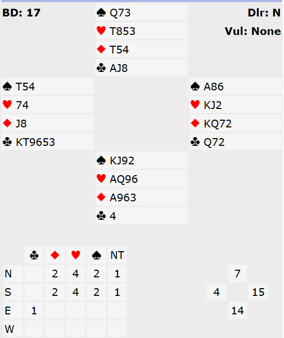 There was also some interest in the bidding too. After a pass from North at many tables East will open a strong 1NT. Some South’s might then choose to show both majors, others might pass. West will pass 1NT but if South does show majors, North will bid 2♥ and it’s likely West will then compete to 3♣.