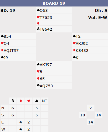 Although spades can be held to 11 tricks, 12 tricks are always available in clubs – despite just having 16 combined high card points! The 10 card fit means there’s plenty of time to draw trumps and ruff the 2 diamond losers – the defence just score one heart trick. That in turn means the “par” result for the board (the theoretical best that both sides can do) is actually 6♦ doubled by East West scoring -500 which is basically a save against -920! Needless to say, on this board, no-one got anywhere near that and -500 would have beaten every North South score except our -750 and one other pair who doubled 5♣ for -650.