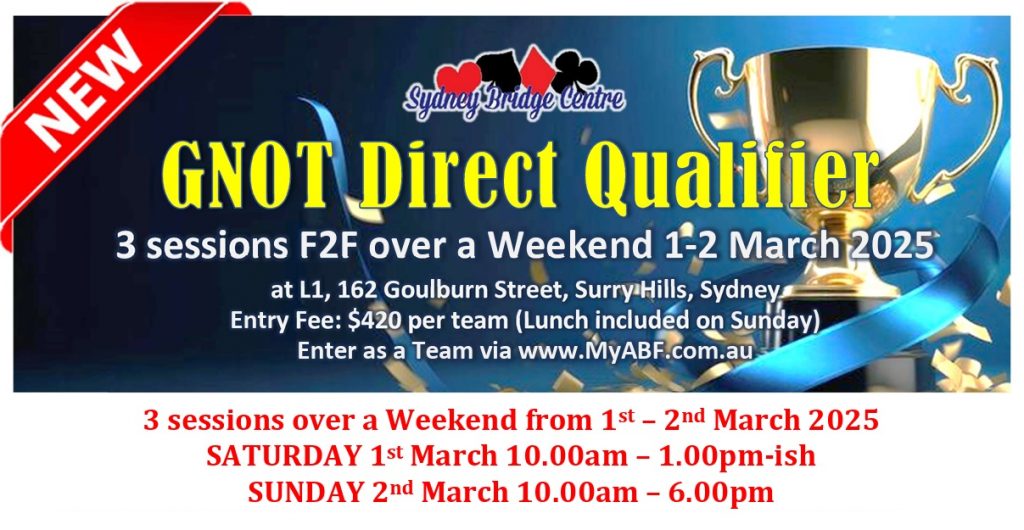 This event qualifies one team directly to the GNOT National Qualifying Online from September 19-21. Entry fee will be paid for by Sydney Bridge Centre.