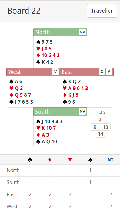 Board 22 last week was another partscore hand where it’s worth both sides competing. East will normally start with 1♥ and South should overcall 1♠. Yes the suit isn’t great quality but it’s at the 1 level, South has plenty of values and the chance to get the spade suit into the bidding and potentially find a fit is too good to miss. That outweighs the risk that his side ends up defending and partner leads ♠K from ♠Kx or something.