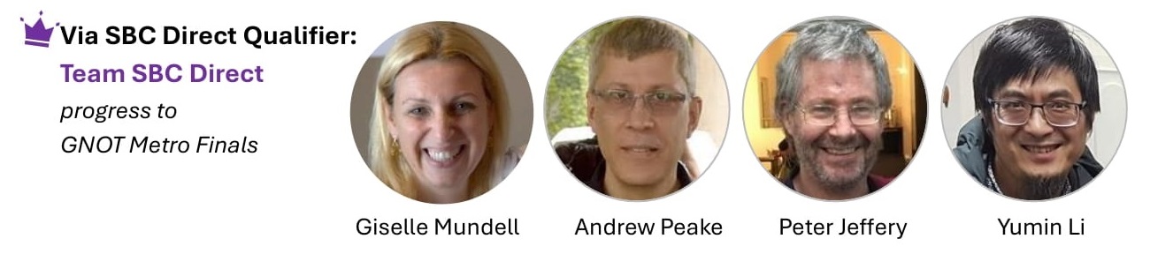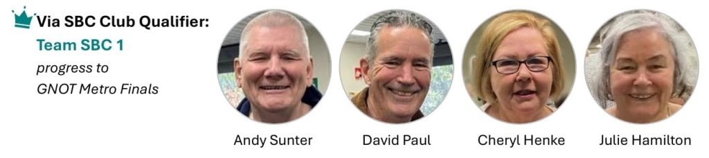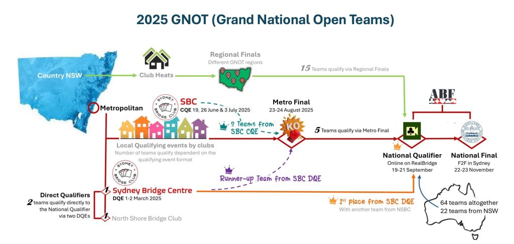 In NSW, the event is run in 3 lines – the Country line and the Metro line; PLUS an additional line via Direct Qualifying events. Sydney Bridge Club is honoured to be granted the right to run a Direct Qualifying event earlier this year, Team SydneyDQE (Shane Harrison – Jessica Brake – Dave Wiltshire – Stephen Williams) bypassed the Metro Final and progresses straight to the National Qualifier. The runner-up Team SBC Direct (Giselle Mundell – Andrew Peake – Peter Jeffery – Yumin Li) progresses to the Metro Final on 23-24 August 2025.