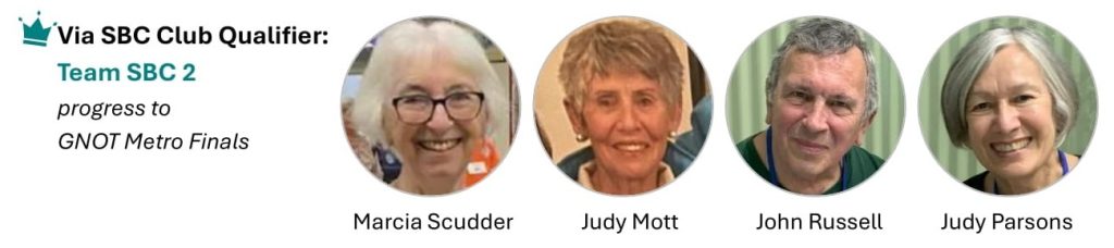 Like any other metro clubs, Sydney Bridge Club ran a Club Qualifying event to select teams to compete in the Metro Final. We ran the Club Qualifying Event in June/July. Two teams were selected to join the SBC Team Direct in the Metro Final – they are SBC 1 (Andy Sunter – David Paul – Cheryl Henke – Julie Hamilton) and SBC 2 (Marcia Scudder – Judy Mott – John Russell – Judy Parsons).