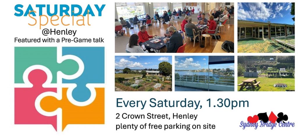 In cooperation with Hunters Hill Bridge Club, Sydney Bridge Centre is now running a regular Saturday Afternoon session in Henley Community Centre, 1.30pm start. The session is featured with a 15-min pre-game talk (1.15pm start). Our volunteers Mitch Dowling, Mick McAuliffe and Wing Roberts will pick an interesting hand from the previous Saturday session and discuss about it. The topics varies, dependent on their observation on the results. Play in, and give them your suggestion of a hand!