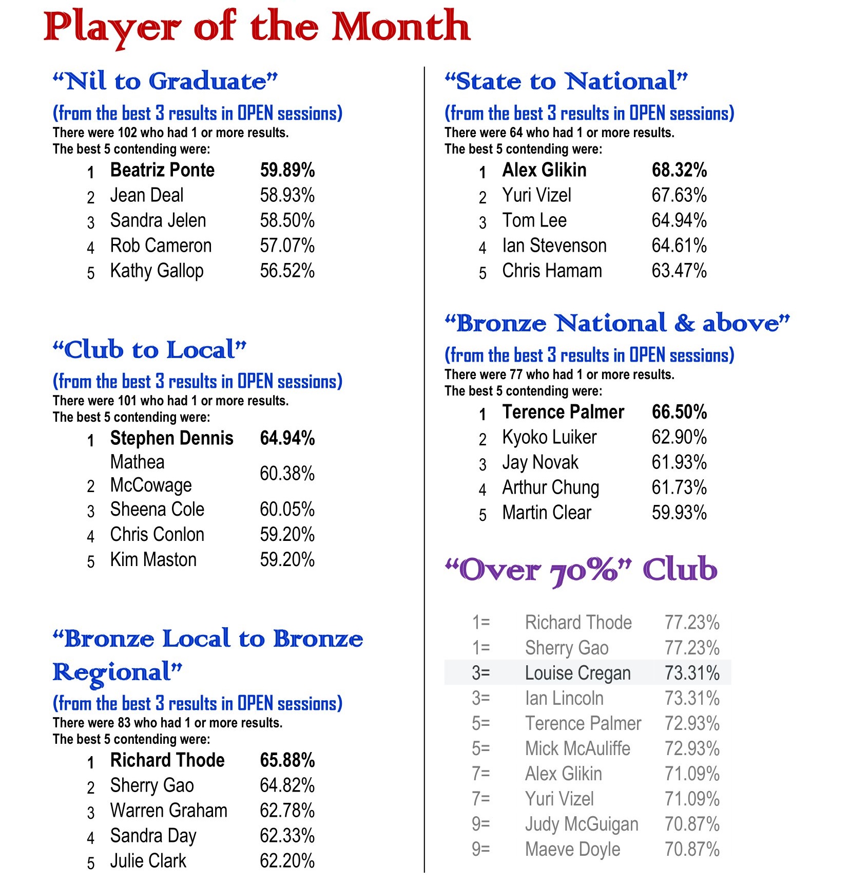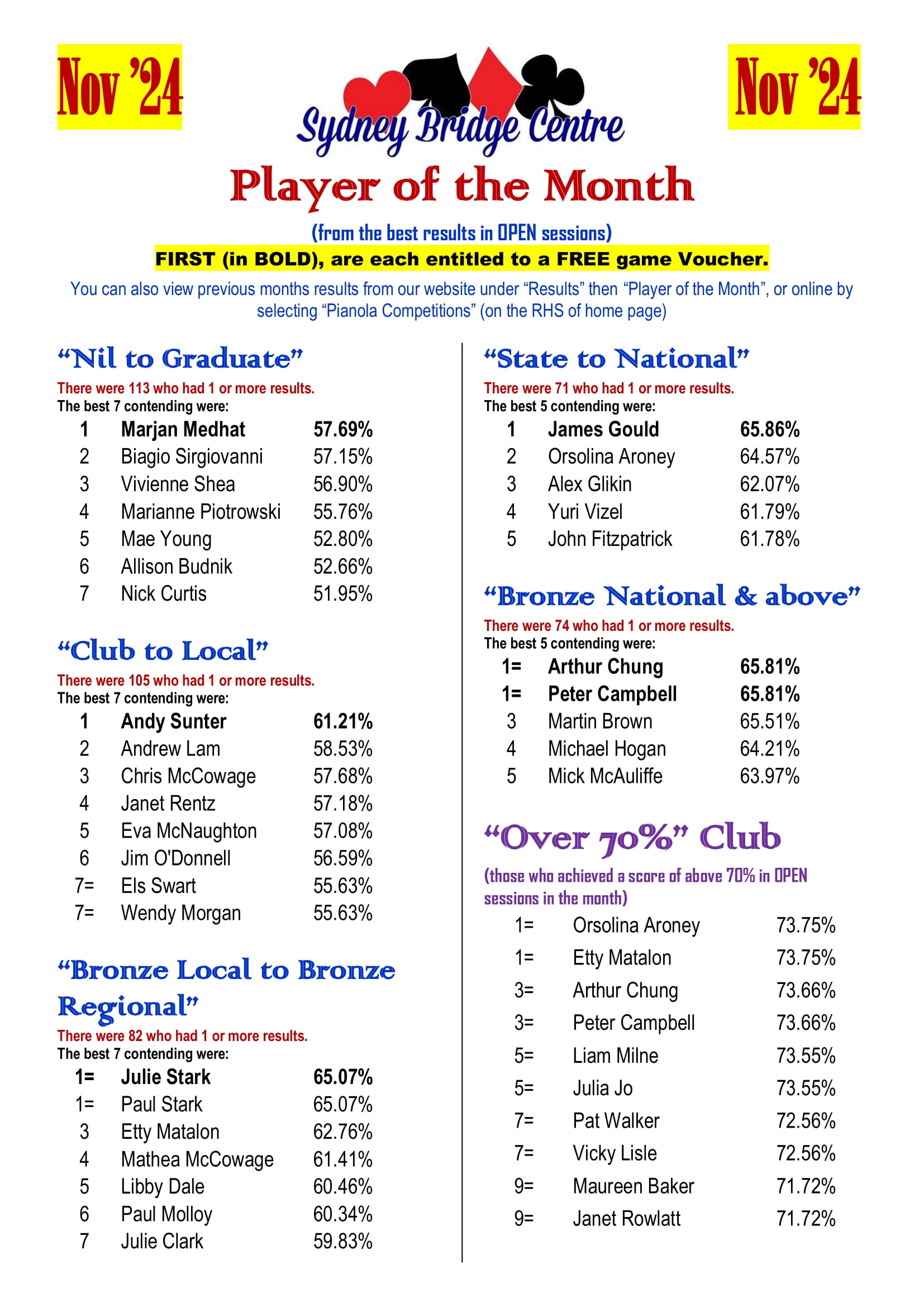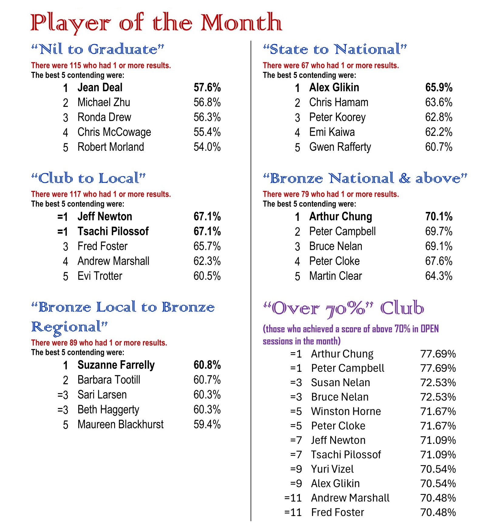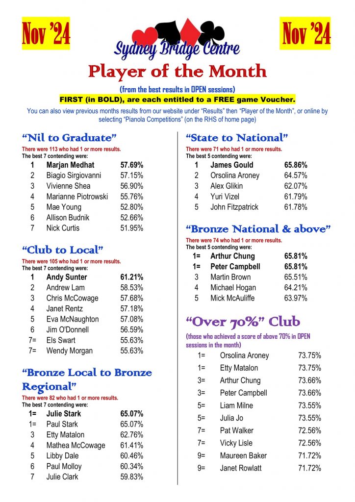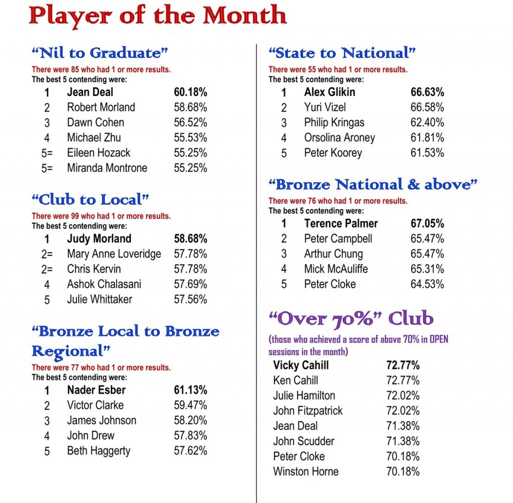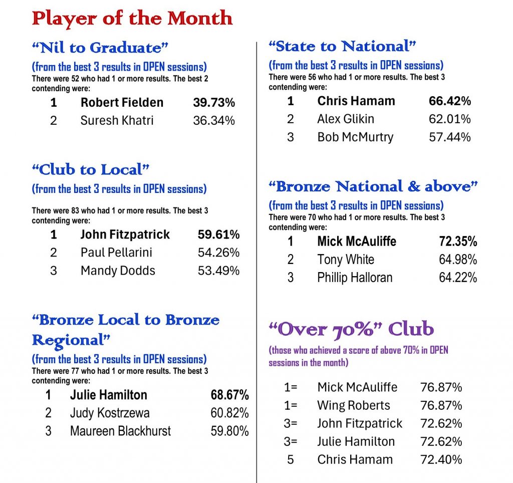 The 2024 SBC Player of the Month competition was a great success. The program was designed to give us an opportunity to acknowledge the achievement of our regular players in their own divisions. To fulfil this purpose, we are going to fine tune the 2025 competition and put more focus on improvement. We are expecting more new faces in next year’s Player of the Month!