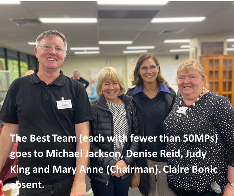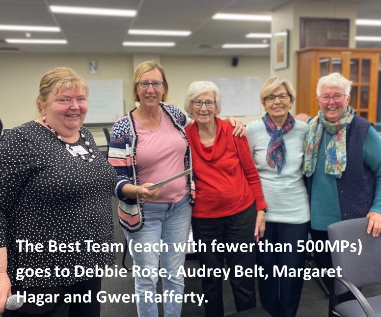 The Best Team (each players with fewer than 500 masterpoints) goes to Team Rose: Debbie Rose, Audrey Belt, Margaret Hagar and Gwen Rafferty. The Best Team (each player with fewer than 50 masterpoints) goes to Team Bonic: Michael Jackson, Claire Bonic, Denise Reid and Judy King.