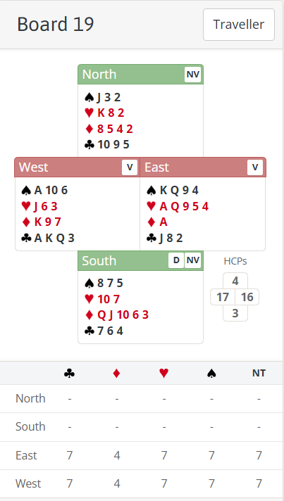 Board 19 last week had a slam available for East West which really should be quite easy to bid. Let’s have a closer look.
