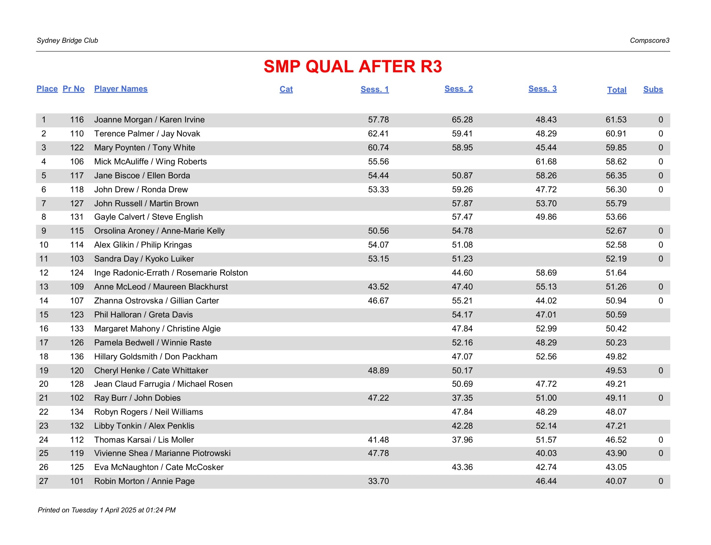The SBC State Mixed Pairs Club Qualifying event went well. We ran it over 3 Tuesday mornings on 18th & 25th and 1st April in the City. More players joined the event from the second week as only 2 best results counted! Most pairs played all 3 to get the best results.