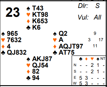 East West could actually make game in clubs on board 23 last week. But it’s almost impossible to bid as we’ll see. At almost every table East West either played diamonds or North South played spades. In spades, the defence may be quite hard and declarer can (and should!) in fact make it harder.