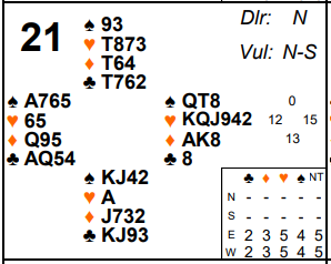 Board 21 saw most East West pairs playing in 4♥ and most made it. But on a normal auction they will probably have passed up an enormous opportunity!