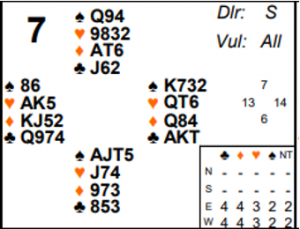 For the 2nd week in a row I’ve picked board 7 to talk about.  This week it’s a hand where almost all East West pairs played 3NT.  Whilst it could have been beaten, in practice it nearly always made with an overtrick.