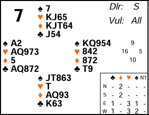 Board 7 last week saw most East West pairs playing in 4♥. With the foul trump break, this contract had no chance and some ended up as many as 5 off!