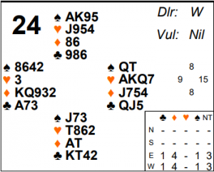 I understand different boards were played at the two Monday sessions last week.  This is a hand from the City session as that was the only one I had hand records for.  Board 24 last week had a game available for East West although it was very close.