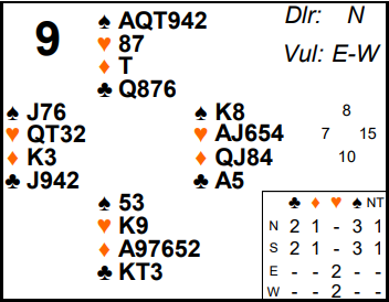 For those North South pairs who did play in spades the hand goes quite well. East might lead ♦Q (nothing else appeals). Declarer will now take some form of spade finesse (it’s a guess really whether to try ♠10 or ♠Q but East’s bidding probably suggests he has more points so I’d be inclined to place him with ♠K and hence try ♠10 which works on this hand). There is also a favourable club position if declarer leads towards the ♣K10x. When the ♣K holds the trick he knows East has the ♣A so he can duck on the 2nd round and the ♣A hits thin air. This will limit his losers to 1 spade, 1 heart and 2 clubs (the 4th club in North is still a loser).