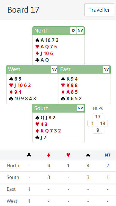 4♠ was a more common contract. East has a horrible lead against that round to a strong NT – I’d probably start with a low trump in the hope of not giving anything away. The trouble is East will get back in and be in trouble again! He can’t lead clubs without giving a trick to ♣Q – but eventually declarer will be able to set his long diamonds up and discard the ♣Q on them anyway. So he should end up losing ♠K, ♥K and ♦A and make 10 tricks (he can discard one more heart on the long diamonds and ruff the 4th heart in the South hand).